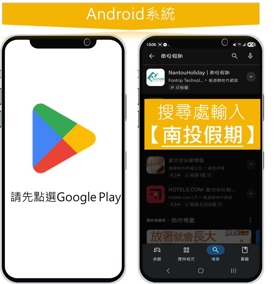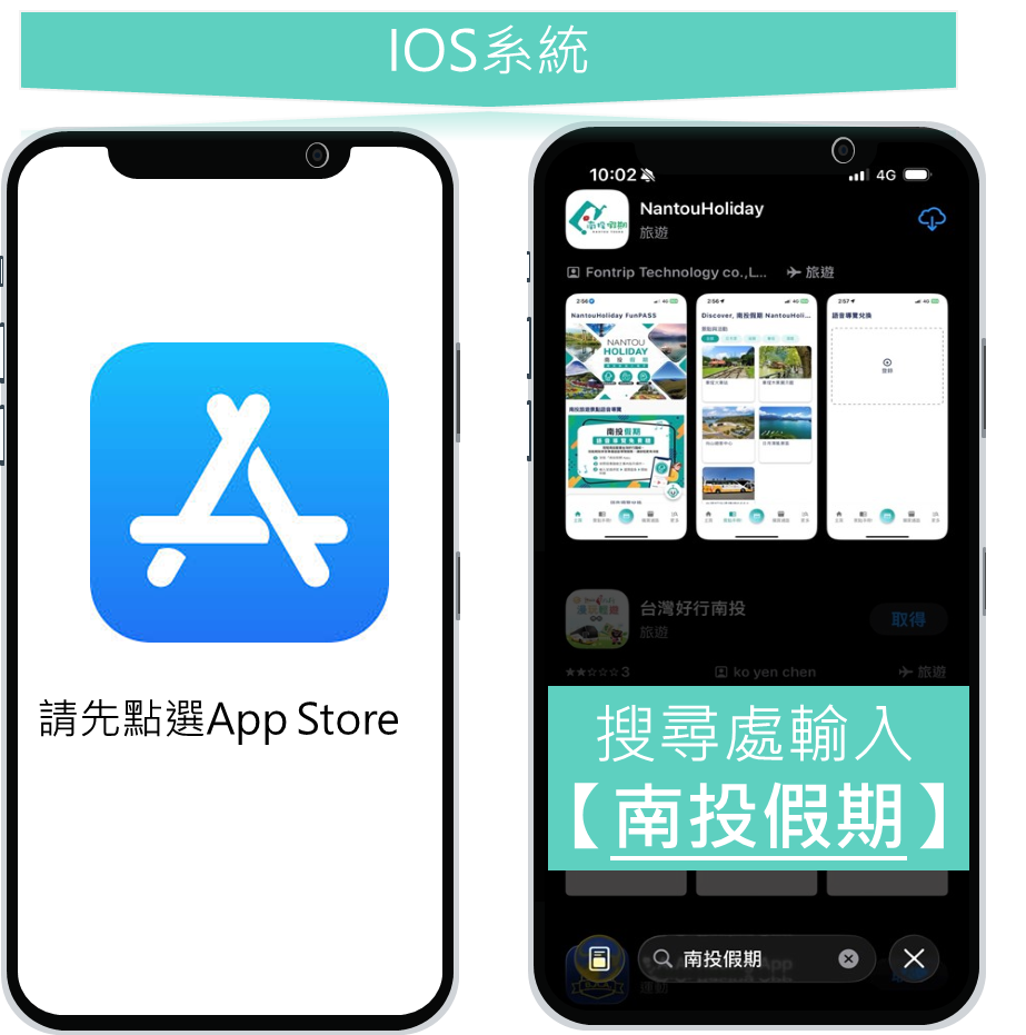 - 請於應用程式商店搜尋: 請於 Google Play 商店 或 App Store 搜尋關鍵字 【南投假期】。